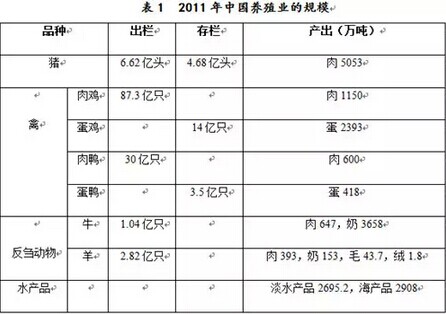 中國是世界上最大的食品動物養(yǎng)殖國,養(yǎng)殖規(guī)模大,養(yǎng)殖密度高,環(huán)境污染嚴重。據(jù)國家統(tǒng)計局,2011年中國肉類總產(chǎn)量7958萬噸、奶3810萬噸、禽蛋2811萬噸、毛類45.5萬噸、淡水產(chǎn)品2695.2萬噸,具體如表1所示。