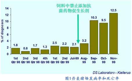 歐盟對獸用抗菌藥在養(yǎng)殖業(yè)上的使用要求比較嚴格。瑞典是最早在飼料中禁止添加抗菌藥物促生長劑的國家,從1999年7月1日起歐盟禁止桿菌肽鋅、螺旋霉素、維吉尼亞霉素和泰樂菌素4種抗生素在畜禽飼料中作為生長促進劑使用,2006年1月1日起歐盟又禁止所有的抗菌藥物促生長添加劑在養(yǎng)殖業(yè)上使用。然而禁止使用抗菌促生長劑對動物健康和動物福利產(chǎn)生了很大的負面影響,丹麥DANMP的報道(2000年)指出禁用后丹麥豬場的發(fā)病率和死亡率增加了600%,如圖1所示。禁用后導(dǎo)致整個歐盟家禽的壞死性腸炎呈流行狀態(tài),飼料報酬下降,上市體重和整齊度降低,大大提高了生產(chǎn)成本。